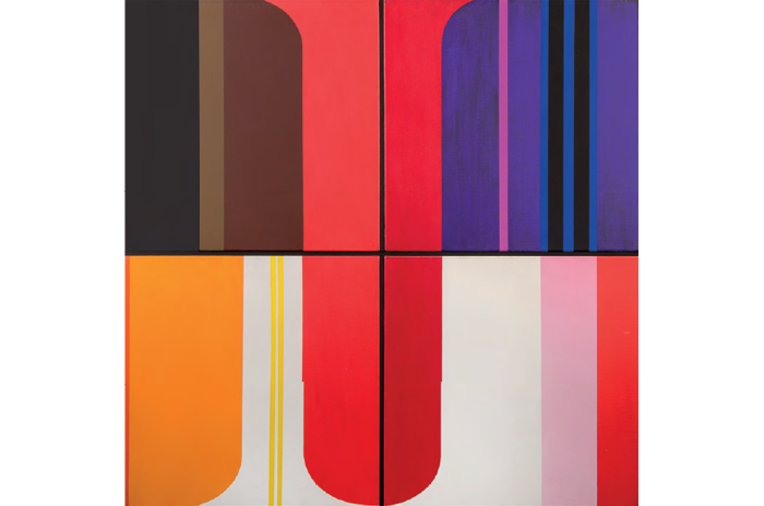 Heinz Kreutz (1923 – 2016), Um rot herum, Streifenbild (4teilig), 1967, Acryl/Leinwand,